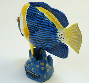 スクリブルド・エンゼルフィッシュ Scribbled Angelfish Chaetodontoplus duboulayi 製作期間2002.2/13-4/05 本体:石粉粘土、アクリルガッシュ、グロスワニス 土台:石粉粘土、クリップの針金、カッターの古刃(重り) 芯材:発泡スチロール、プロモデルのランナー ネームプレート:プリンタ、セロテープ フィギュア6号は、 もともとはタテキン君だったのです(笑) 今となってはどうして作り直したのか記憶がないです(^^; プロポーションが気に入らなかったんだと思います。 そんなこともないのにねぇ・・・今見ると(笑) でも捨てちゃうのももったいないのでその時の形が いちばん近かったスクリブル君に生まれ変わりました♪ |