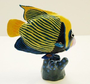 タテジマキンチャクダイ Emperor Angelfish Pomacanthus imperator 製作期間2002.2/19-3/20 本体:石粉粘土、アクリルガッシュ、グロスワニス 土台:石粉粘土、クリップの針金、カッターの古刃(重り) 芯材:発泡スチロール、プロモデルのランナー ネームプレート:プリンタ、セロテープ お魚フィギュア第4号です。 豪勢な魚を作りたくてヤッコの仲間を選びました(笑) その中でもラインや色のハッキリしている タテキン君が作りやすそうだと思いました。 逆に作りにくそう・・・と思ったのは クイーン・エンゼルフィッシュ(汗) |