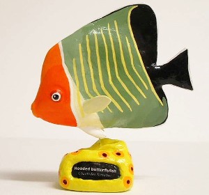 オレンジフェイス・バタフライフィッシュ Hooded Butterflyfish Chaetodon larvatus 製作期間2003.1/7-2/3 本体:石粉粘土、アクリルガッシュ、グロスワニス 土台:石粉粘土、クリップの針金、カッターの古刃(重り) 芯材:発泡スチロール、プラモのランナー ネームプレート:プリンタ、セロテープ お魚フィギュア第18号、 ここのところ大好きなオレンジフェイス君に・・・ とても上品な配色と色あわせなんですよぉ♪ 今までやったことない暖色系でまとめてみました♪ ♪はーるよこい♪はーやくこい♪ |